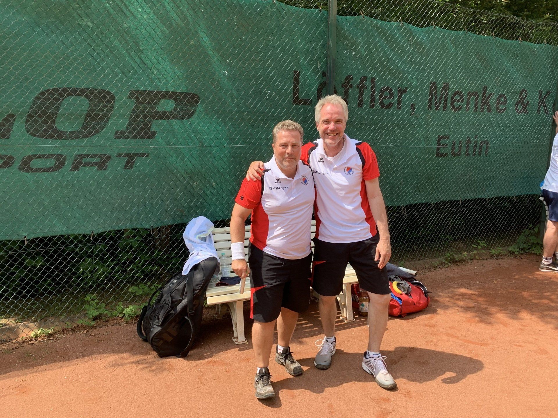 Mit Andreas an 1 und Thorsten an 3 bestand eine realistische Chance auf weitere zwei Matchpunkte. Andreas bestätigte seine bisherige Siegesserie mit einem deutlichen 6:0; 6:0 und sicherte den dritten Matchpunkt für die STVer. Thorstens Ergebnis war gleichsam deutlich mit 6:0; 6:0, allerdings war der Weg dahin erheblich beschwerlicher, da sein Gegner ein sehr starkes Aufschlag- und Returnspiel ablieferte, jedoch die entscheidenden Punkte von Thorsten eingefahren wurden. Bei zuletzt praller Sonne und enormer Hitze hatten dann beide alles aus sich herausgeholt und wir 4:0 Matchpunkte auf dem Konto.