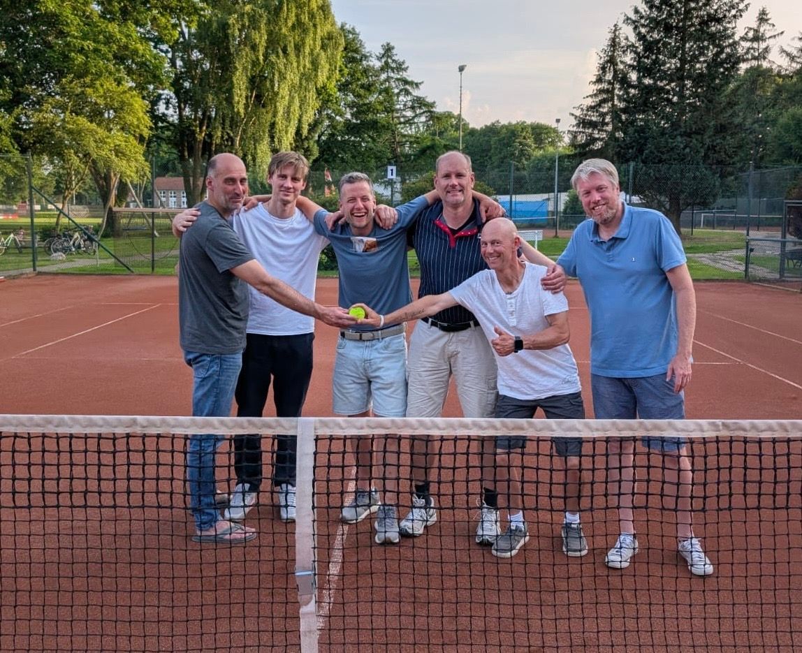 Herren 40 Nordliga - Letztes Heimspiel am Sa. 28.06. um 13h für den Klassenerhalt! Die Saison begann am 10.05. mit dem Heimspiel gegen die Hamburger TSV DUWO 08 (auf dem Papier stärkste Mannschaft in der Nordligagruppe), die den Aufstieg anstreben und im Winter bereits Regionalliga spielen. Anders Stenman gewann sein Einzel klar mit 6:1 6:1 an Position 4 und Percy Rowlin verlor sein Einzel knapp an Position 1 im Champions Tiebreak mit 5:7 6:4 4:10. Alle anderen Einzel wurden leider klar verloren, auch begünstigt durch unsere doch gesundheitlich etwas angeschlagene Truppe. Rückenprobleme bei Candy Pfitzner, Fußverletzung bei Lars Godenschweger und Sven Engewald sowie Leon Blüggel konnten verletzungsbedingt gar nicht erst zum Einsatz kommen. So gingen leider auch alle drei Doppel verloren (eines davon wieder im Champions Tiebreak). Diese Niederlage war einkalkuliert aber mit 1:8 doch etwas unglücklich. Alle anderen Mannschaften befanden sich aber auf Augenhöhe und so reiste man zuversichtlich am 24.05. für das zweite Spiel zum THC von Horn und Hamm. Percy Rowlin, Nyls-Arne Pasternack, Candy Pfitzner und Anders Stenman gewannen ihre Einzel während Tobias Meyer und Fabian Hirschberger beide knapp im Champions Tiebreak verloren. Trotzdem führte man somit 4:2 nach den Einzeln und konnte so strategisch das dritte Doppel stark machen. Tobias Meyer und Anders Stenman konnten hier den entscheidenden Sieg zum 5:4 einfahren. Unglücklich verloren Percy Rowlin und Lars Godenschweger knapp im Champions Tiebreak 9:11 nachdem man schon 3 Matchbälle vergeben hatte. Für das dritte Spiel am 31.05. ging es zum TC an der Schirnau. Auch hier rechnete mach sich gute Chancen aus. Tobias Meyer, Lars Godenschweger und Fabian Hirschberger konnten ihre Einzel gewinnen. Percy Rowlin musste mit Rückenblockade leider im zweiten Satz aufgeben, Candy Pfitzner verlor sehr knapp im Champions Tiebreak 8:10 und auch Leon Blüggel konnte sein Einzel nicht gewinnen. So stand es 3:3 nach den Einzeln und man hatte trotzdem noch alle Siegchancen. Aber die gesundheitlichen Probleme nach den Einzeln waren wieder präsent und alle drei Doppel gingen verloren. Eine Niederlage mit 3:6 Punkten war somit dann schon etwas bitter. Für das vierte Spiel am 14.06. ging es nach Niedersachsen zum TC Salzhausen. Hier hatte man gerade in der Hallensaison 4:2 gewonnen und war zum erneuten Sieg angereist. Leider verlor Candy Pfitzner mit 3:6 2:6 etwas angeschlagen sein Einzel und auch Percy Rowlin verlor an Position 1 sehr knapp 4:6 4:6. Noch knapper im Champions Tiebreak verloren Leon Blüggel und Fabian Hirschberger, an diesem sonst schönen und heißen Sommertag. Tobias Meyer und Anders Stenman konnten dahingegen ihre Einzel gewinnen und so stand es 2:4 vor den Doppeln. Aber mit 3 Doppelsiegen konnte man rechnen, da man nun mit Lars Godenschweger und Sven Engewald geschonte Spieler einsetzen konnte. Die Rechnung ging zunächst auf und Tobias Meyer und Lars Godenschweger konnten ihr Doppel als erstes gewinnen. Auch Anders Stenman und Leon Blüggel setzten sich im harten Kampf, trotz Krämpfen, im Champions Tiebreak ebenfalls durch. Im ersten Doppel mit Percy Rowlin und Sven Engewald führten unsere Spieler schon mit 3:0 siegesgewiss, aber dann erlitt Sven eine heftige Muskelzerrung. So musste das entscheidende Doppel dann doch schweren Herzens aufgegeben werden. Die Salzhausener kamen so mit einem sehr glücklichen 5:4 Sieg davon. Trotzdem ist man in der Tabelle noch vor Salzhausen (zwar punktgleich aber zwei Matchpunkte Vorsprung). Salzhausen muss am letzten Spieltag zur stärksten und ungeschlagenen Mannschaft Duwo 08 reisen, während unsere Mannschaft ein Heimspiel am Sa. 28.06. gegen Ahrensburg um 13 Uhr bestreitet. Letze Saison konnte man Ahrensburg schlagen. Eine knappe Niederlage könnte zwar auch zum Klassenerhalt reichen, aber man will es nicht darauf ankommen lassen. Wir freuen uns über möglichst große Unterstützung auf der Anlage. Für Kuchen und Kaffee ist gesorgt. Bis dahin! Bildunterschrift zum Foto: Gute Stimmung trotz knapper Niederlage in Salzhausen: v.l. Tobi, Leon, Fabian, Lars, Percy, Anders