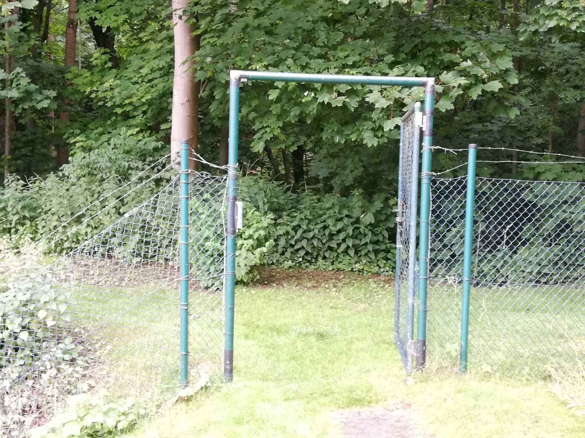 Die idyllische Lage der Tennisplätze und die geschlossene Gastronomie stellten uns vor eine pragmatische Herausforderung: siehe Foto – Tür zu den WCs (Pinkeln im Gebüsch), Duschen zu Hause… und natürlich keine Sauna wie auf den verheißungsvollen Werbebanner.
