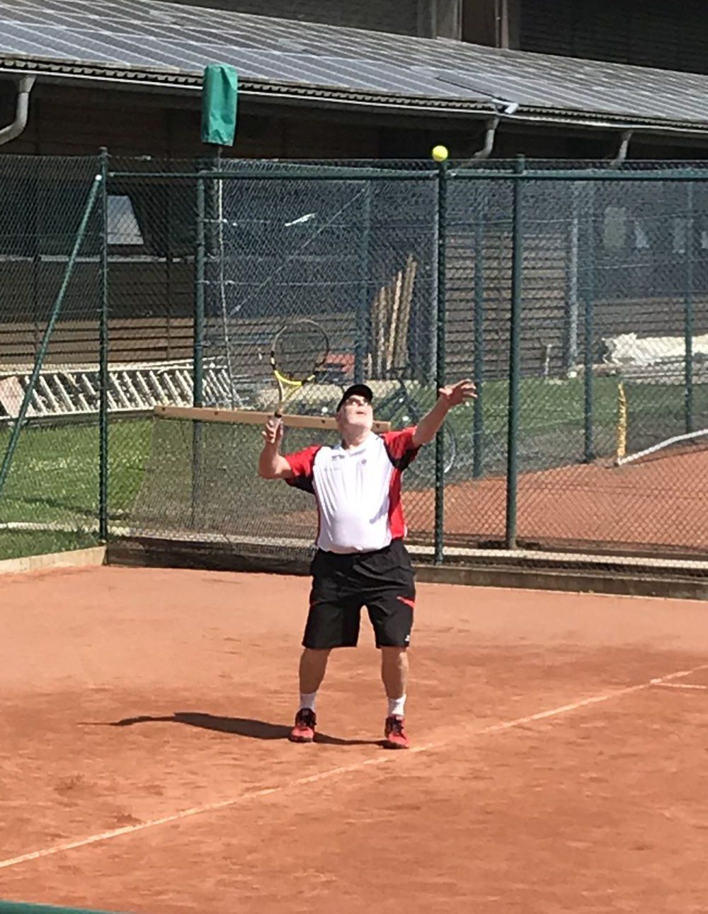 Deutlich länger mühten sich bei mittlerweile brütender Hitze Jens und sein Spielpartner auf dem „Center Court“. Nach mit 6:2 gewonnenem ersten Satz musste Jens den zweiten mit 2:6 abgeben. Der einzige Match Tiebreak des Tages musste also die Entscheidung bringen. Und wie so oft entscheidet dann ein Winner oder unerzwungener Fehler die Partie – so war es auch in diesem Match. Nach großem Kampf ging der Punkt mit einem 8:10 an die Gäste; zwei sichtlich gezeichnete Spieler konnten dennoch stolz auf Ihr Spiel sein.